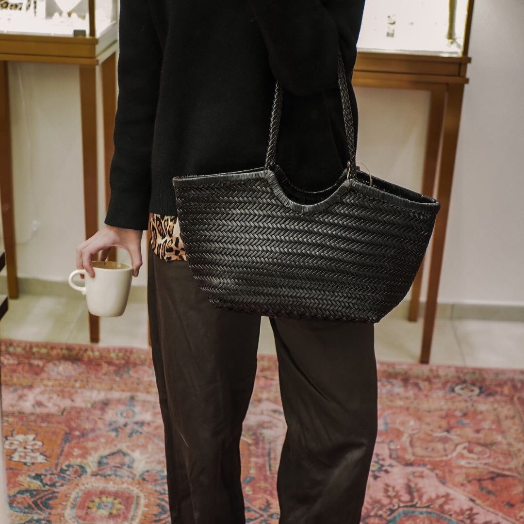 Parce que nos bijoux ont toujours raconté des histoires, il était naturel que nos sacs prennent la parole à leur tour. Chaque sac, chaque tressage, chaque couture dit la patience des mains et la douceur du cuir de vache choisi avec exigence.