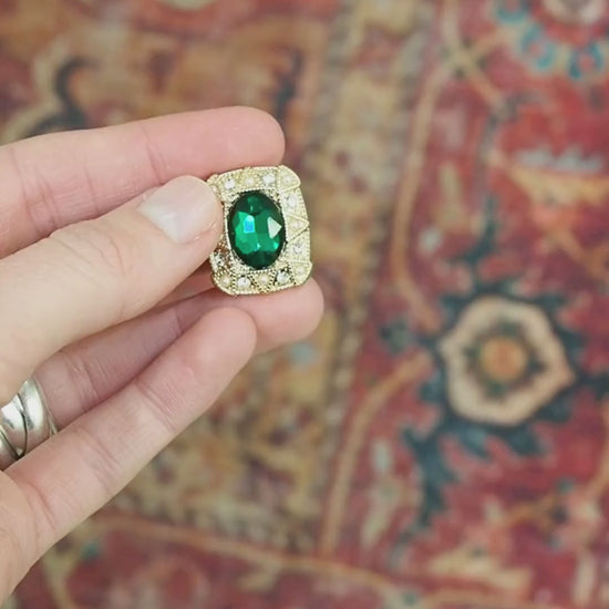 Cubierta de botón con clip dorada y piedra verde esmeralda